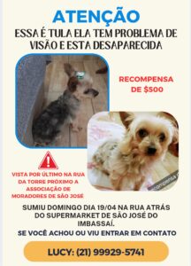 A tutora oferece recompensa de R$ 500 para quem ajudar a localizar Tula e pede que qualquer informação seja repassada pelo telefone (21) 99929-5741, falar com Lucy.