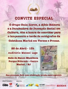 LSM – A coletânea “Maricá em Versos e Prosas”, será lançada no sábado, 25, a partir das 13h, no auditório Manoel Lago, no Banco Mumbuca. O livro apresenta os contos, poemas e crônicas de 20 escritores locais, selecionados pelo júri de um concurso literário realizado pela Editora Afeto, com suporte do Grupo Gaia Livros, trazendo em suas linhas fantasias, sentimentos e reflexões dos autores sobre a vida, o passado, possível futuro, cotidiano e as paisagens da cidade.