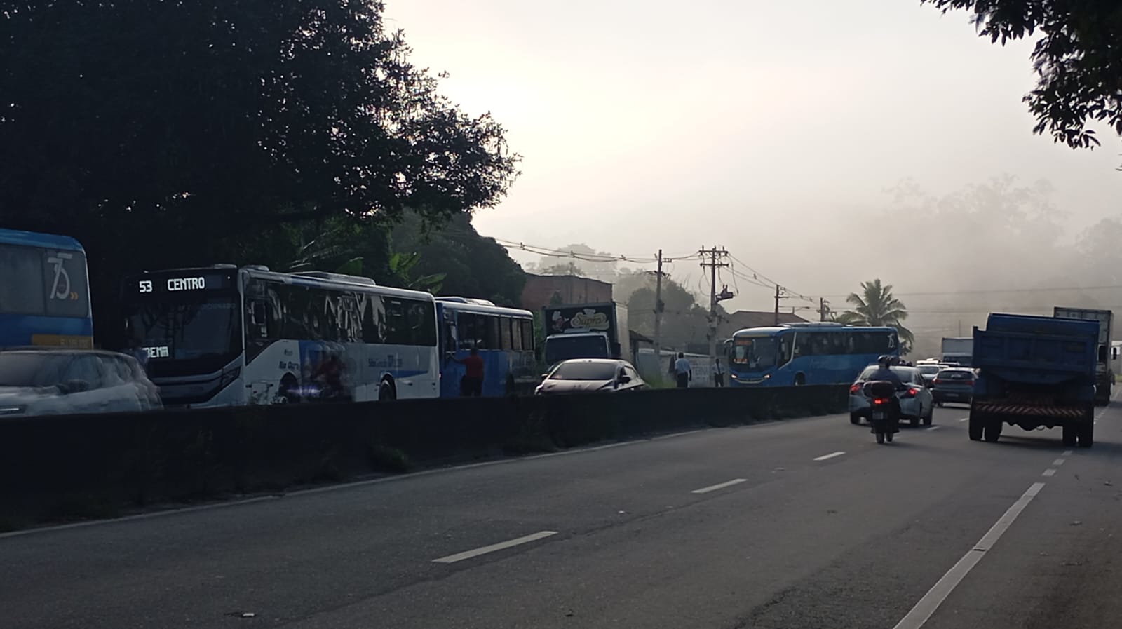 De acordo com informações, o transtorno foi causado após um caminhão reboque atingir um poste e romper um cabo de energia elétrica, que ficou caído sobre a pista.